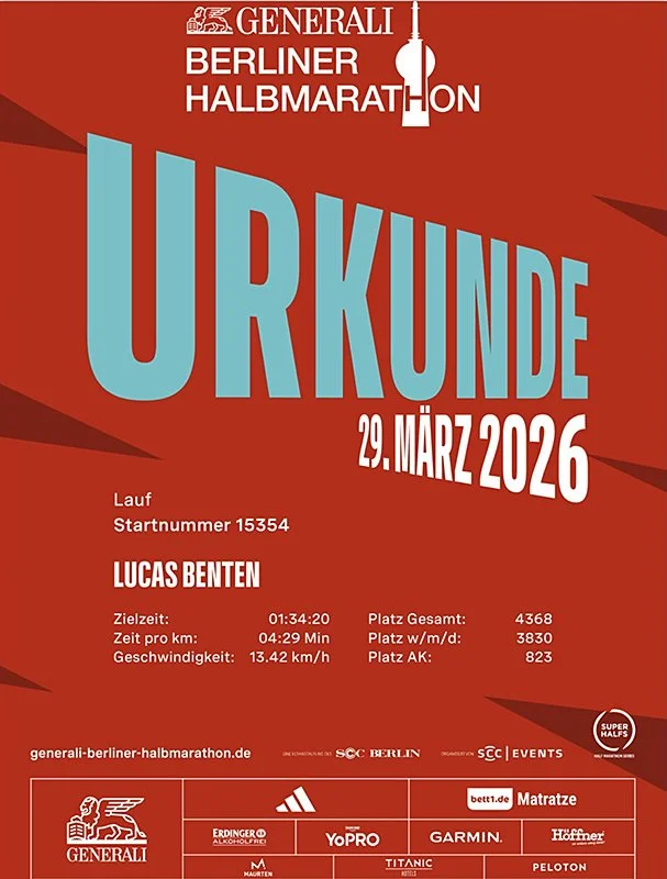 Im Ziel am Brandenburger Tor konnte er das Rennen nach 1:34:20h mit einer persönlichen Bestzeit beenden: Damit wird man 4.368. im Gesamtklassement, erreicht Platz 3.829 unter den Männern und 823 in der AK35.